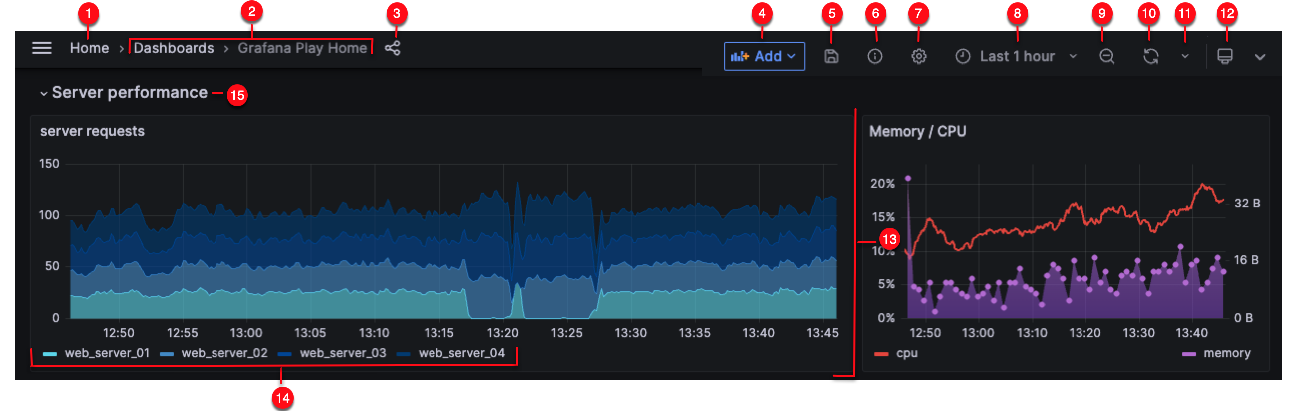 - (15) Dashboard row: A dashboard row is a logical divider within a dashboard that groups panels together.