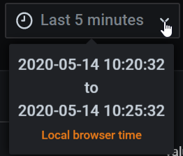 Click the current time range to change it. You can change the current time using a relative time range, such as the last 15 minutes, or an absolute time range, such as 2020-05-14 00:00:00 to 2020-05-15 23:59:59.