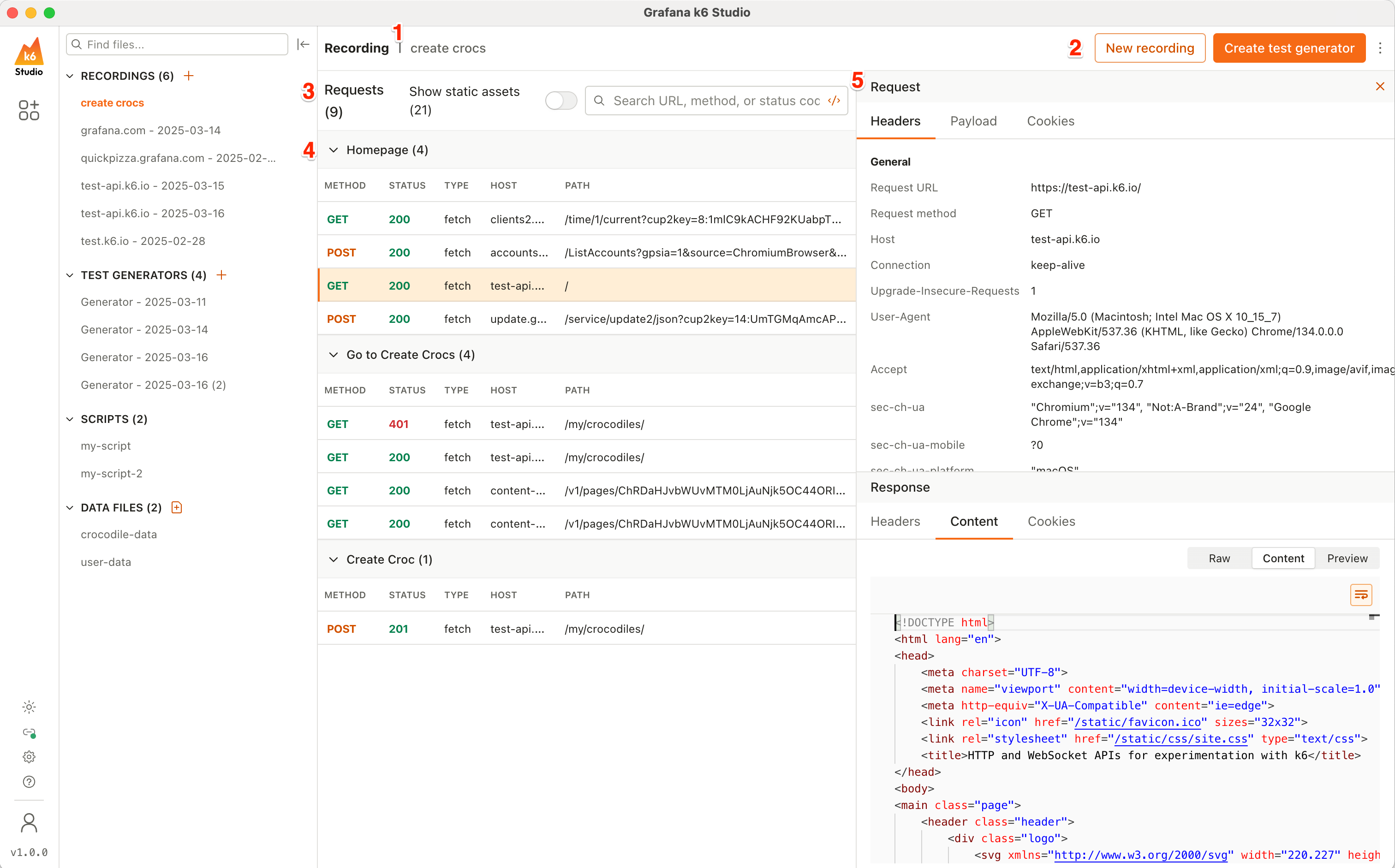 k6 Studio collects every request and response, as well as browser interactions. After you stop the recording, it generates a HAR file including the browser events. You can then inspect every request and response to see if your test recording accurately reflects a user flow, and then use it as the source for your test script.