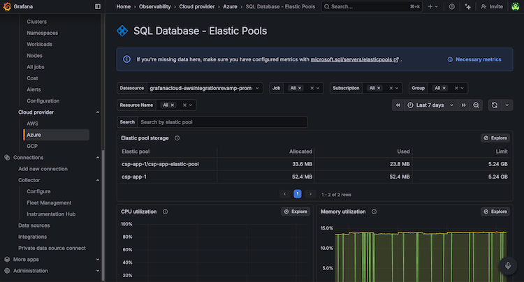Grafana Cloud Provider Observability provides serverless monitoring for your Azure infrastructure without requiring additional setup or maintenance overhead. The Cloud Provider Observability Azure solution collects metrics from Azure Monitor and presents them through pre-built dashboards optimized for Azure services.