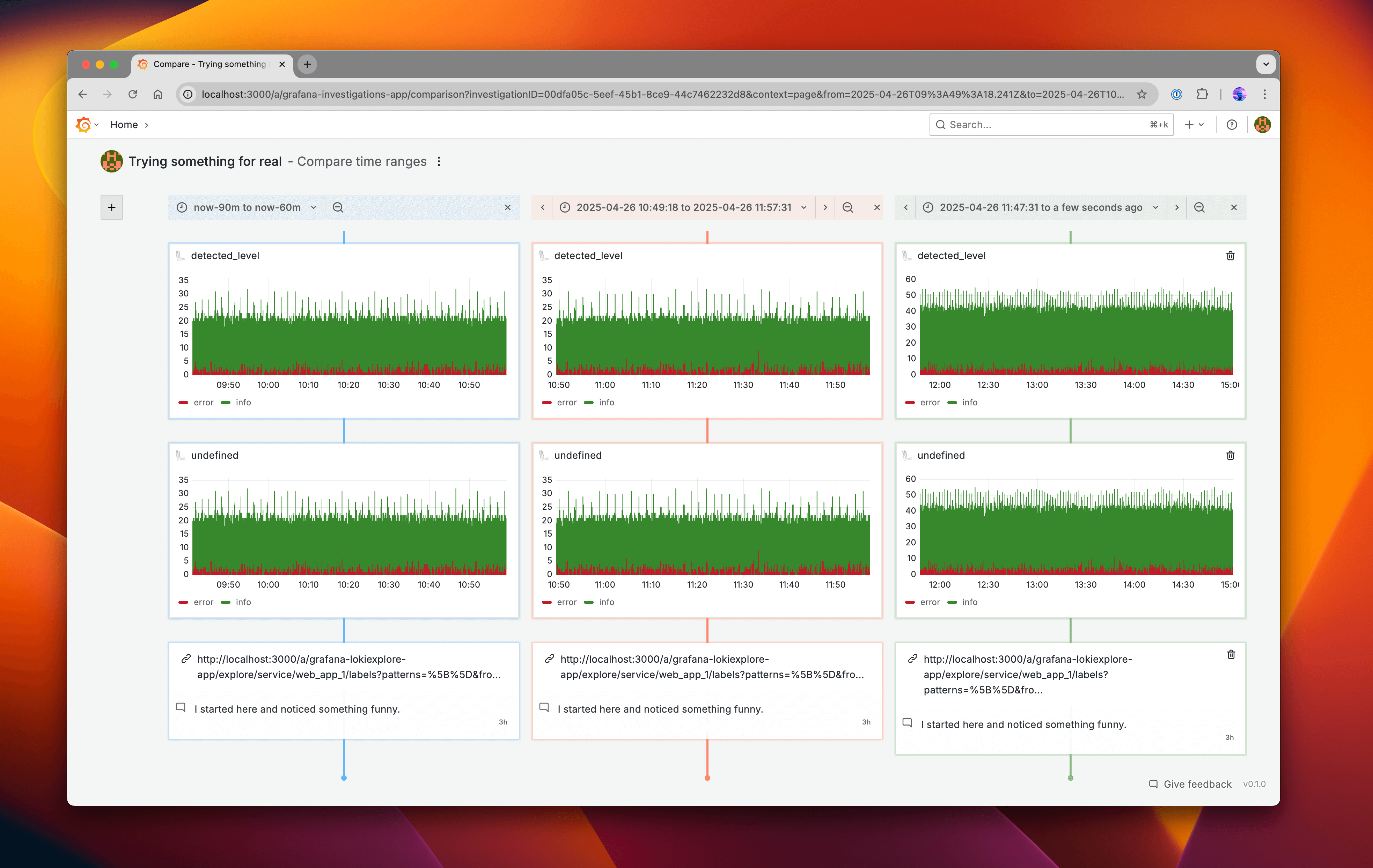 This feature is especially useful when you treat investigations as templates for common things you usually check together. Instead of recreating your investigation from scratch, you can quickly reuse it to compare the current situation with previous incidents, deployments, or baseline periods.