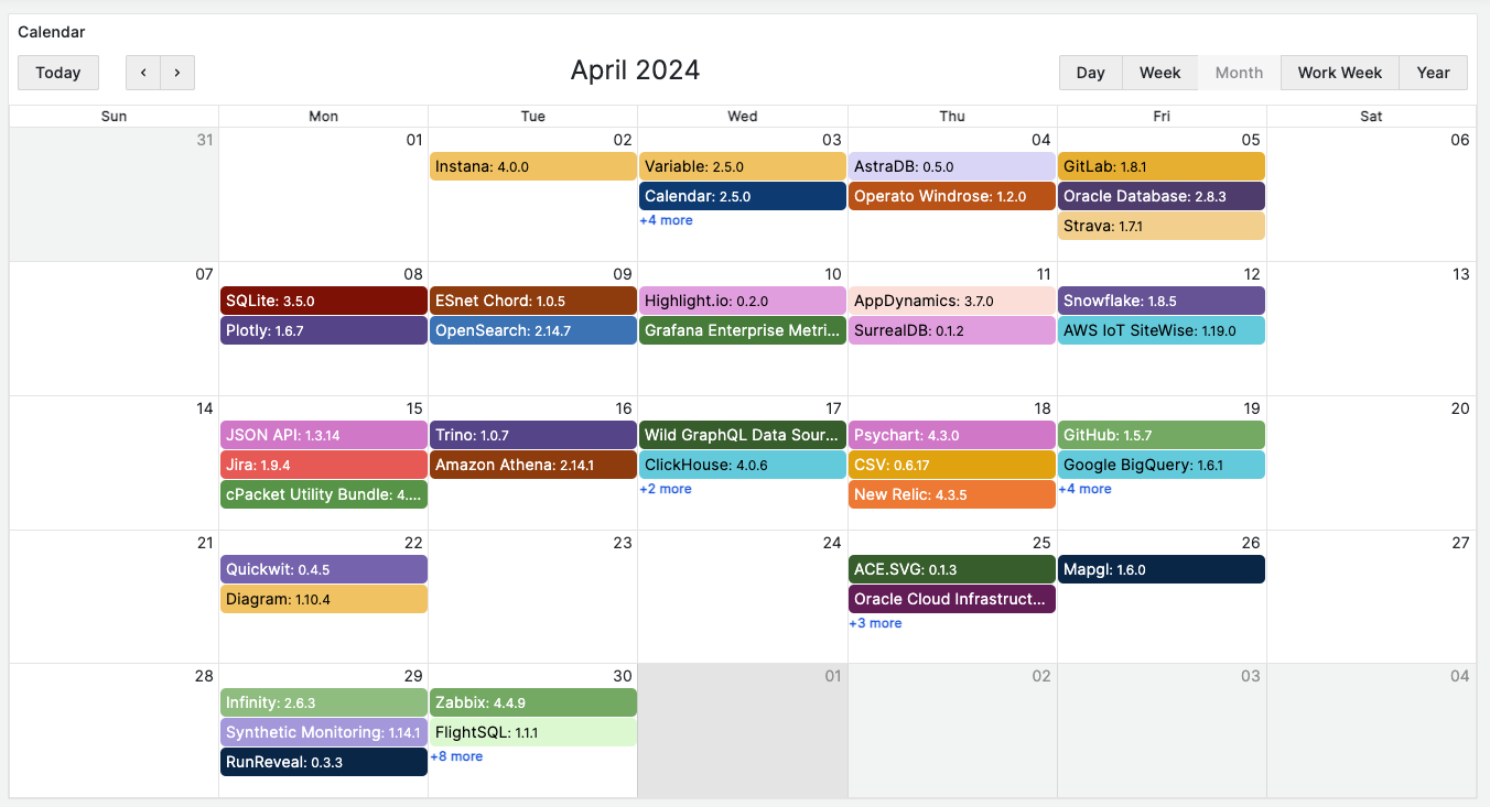 - Calendar panel 2.X requires Grafana 9.2 or Grafana 10.