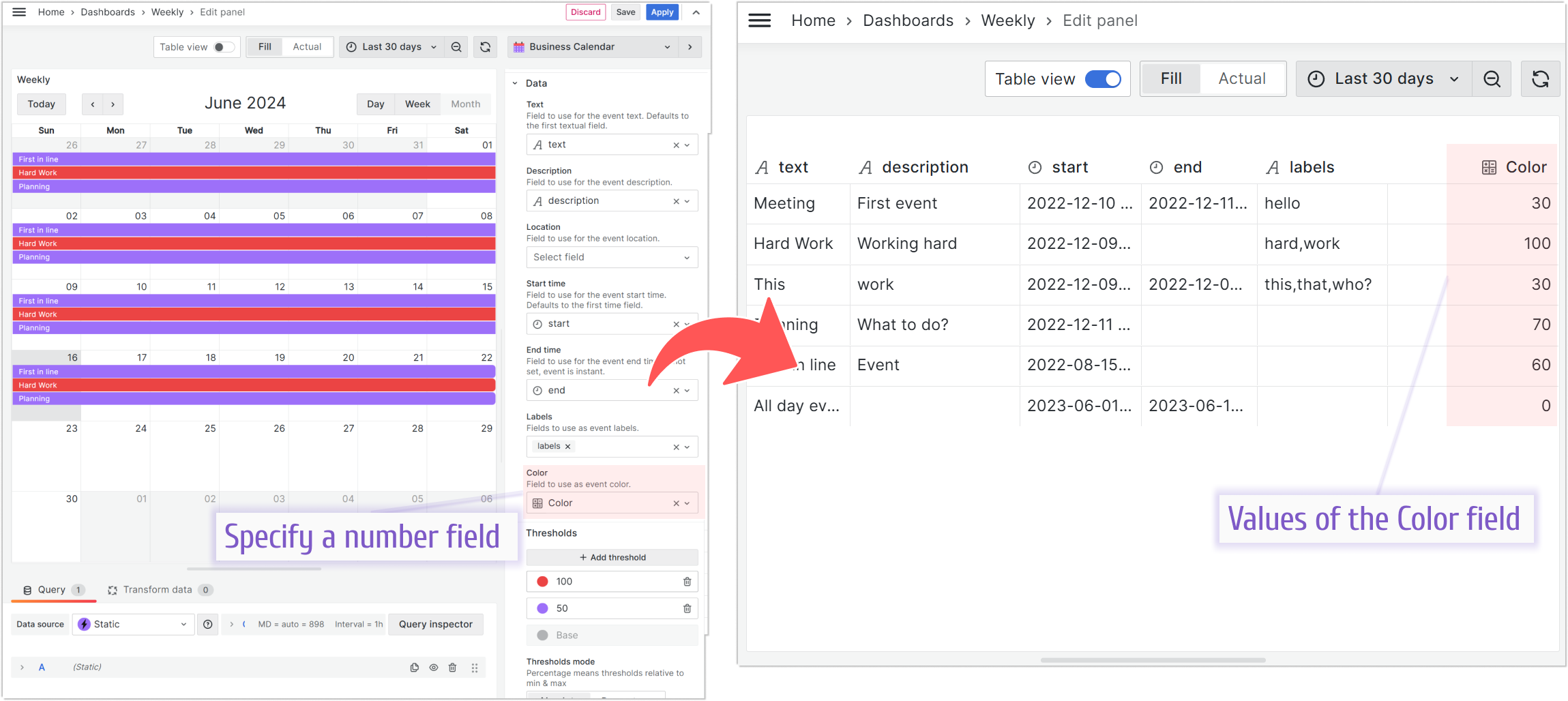 You can color events in different tones based on whether their values fall within a specific threshold. In addition, you can choose a classic color palette in the plugin’s options.