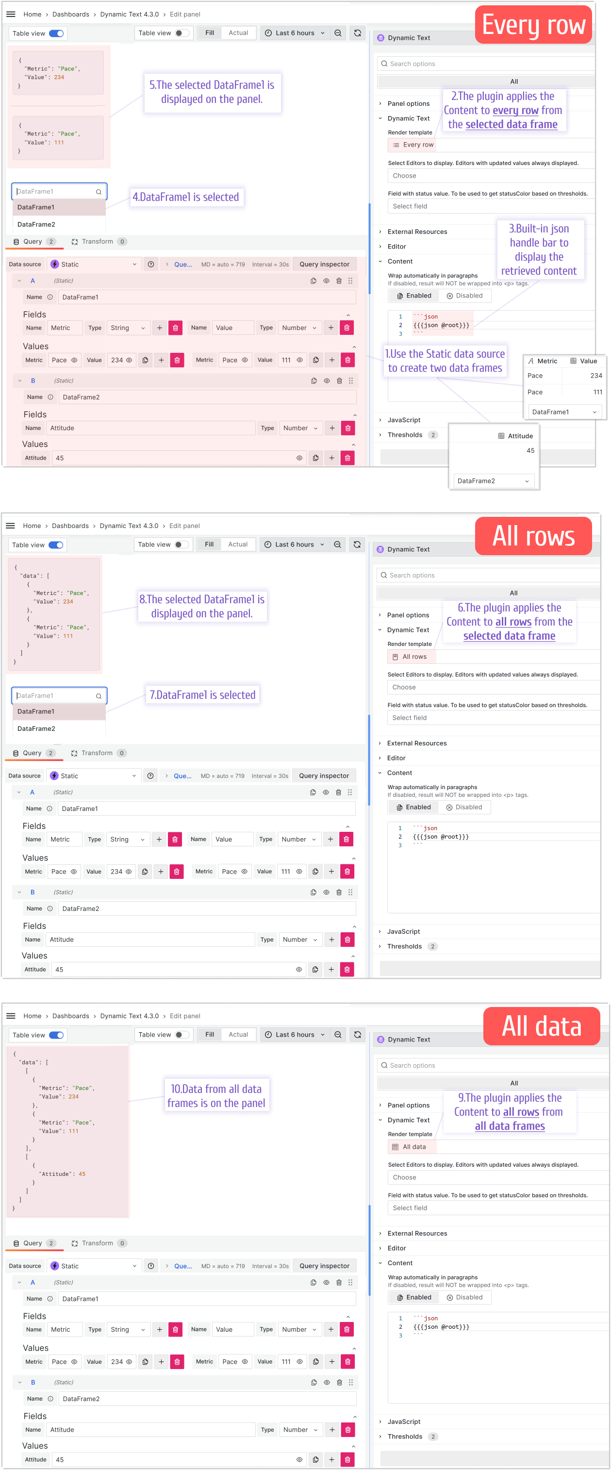 datafield to the Content template. Your template renders once. To work with query results as a whole, use the #each built-in helper to iterate through records. - All data: The query results from all data frames are passed as a