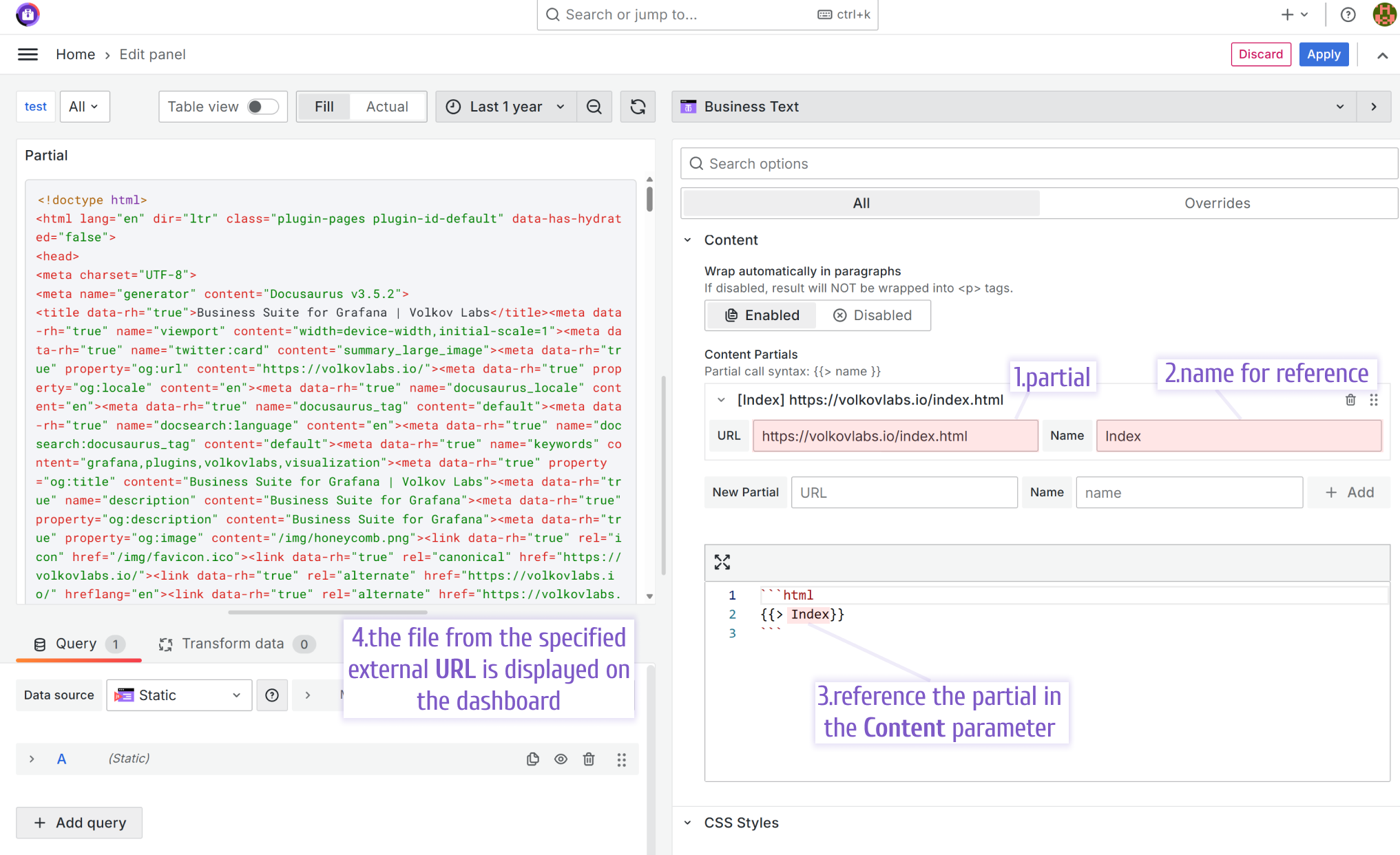 In addition to external CSS files and JavaScript libraries, you can use external Handlebars partials in the Content parameter.