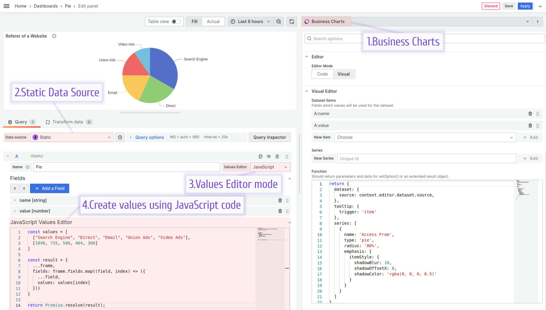 You can use the Business Charts demo project to play with both the Business Input data source settings and the Business Charts parameters following the link Business Charts Pie examples. Go to Edit mode and start experimenting.