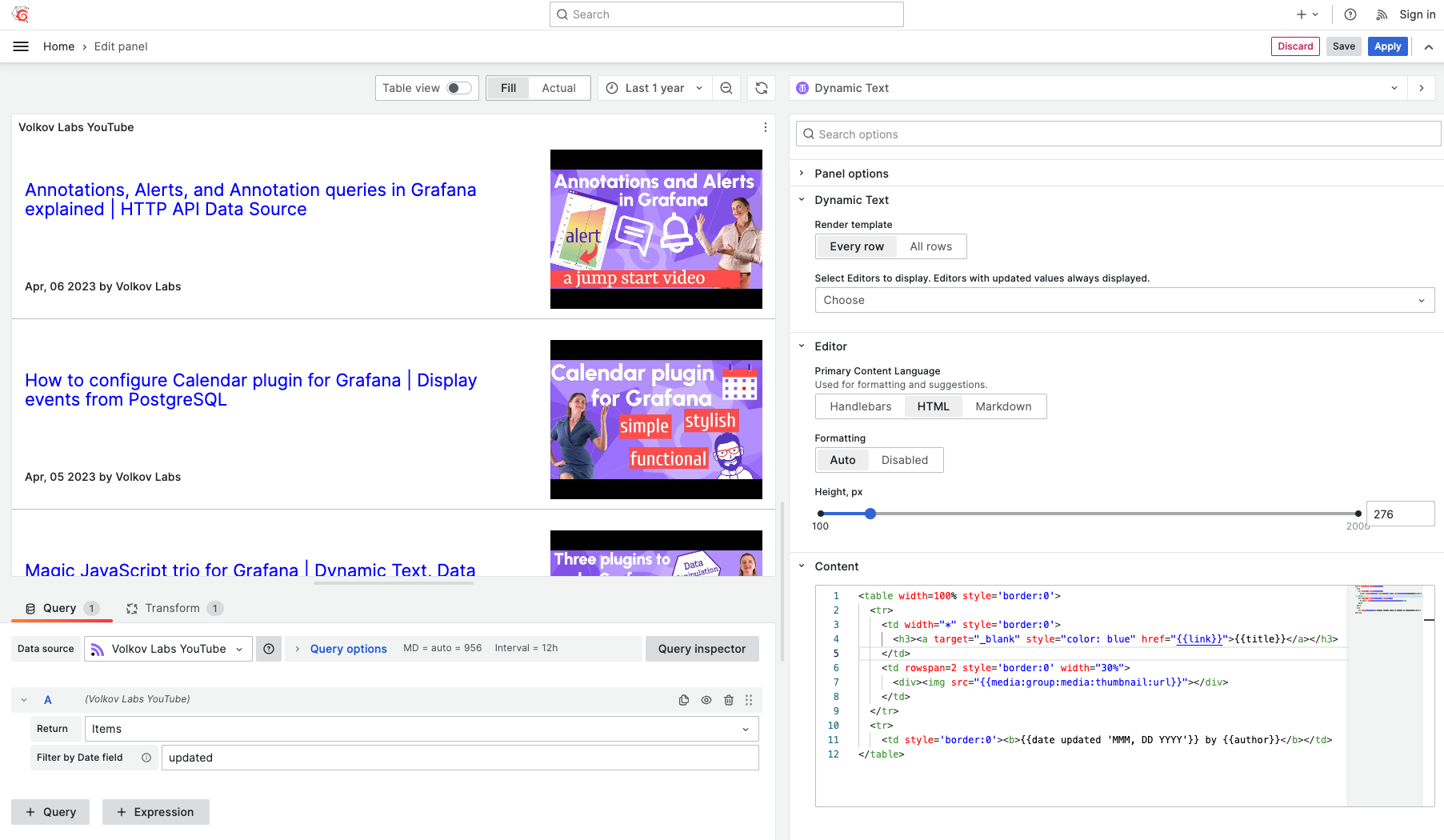 To display the YouTube feed with the latest videos, this example uses HTML and Handlebars templates for data fields.