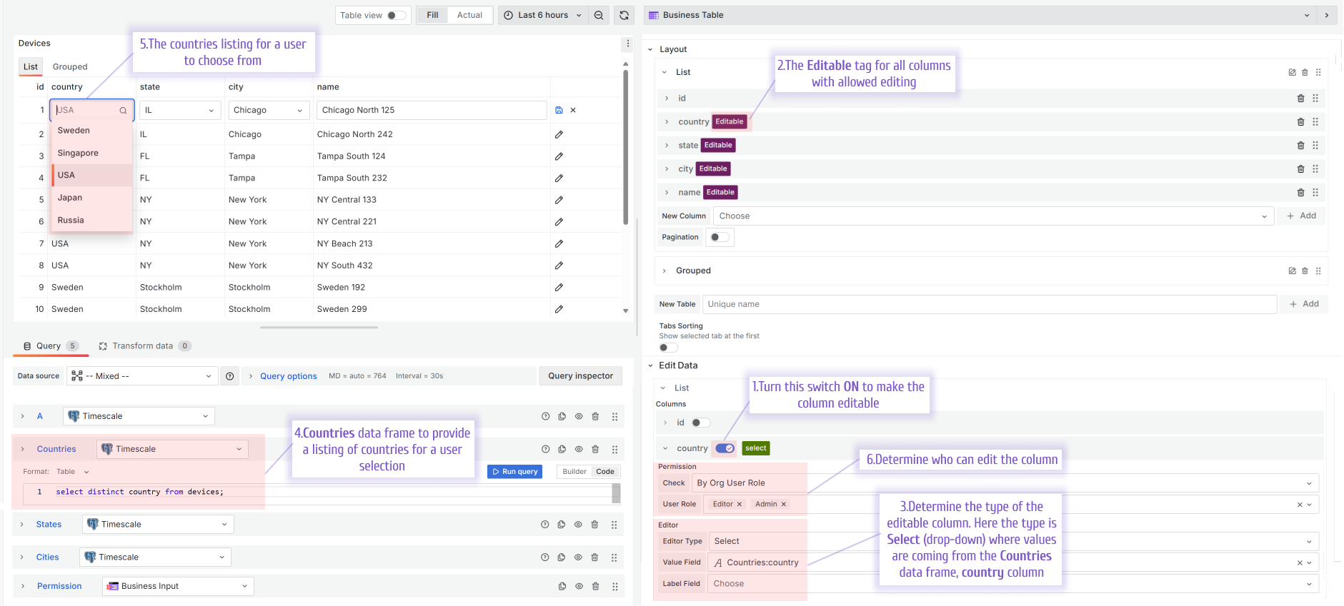 To allow editing on a column, enable the switch. The Editable tag appears next to the column name in the Layout category.