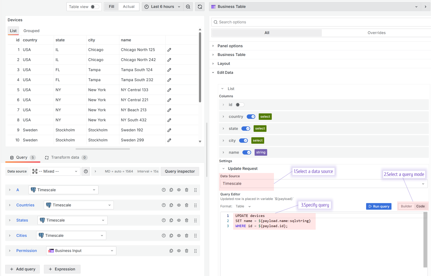First, select the data source where you want to send the updated values. Then, choose the Query Editor mode if your data source supports it: