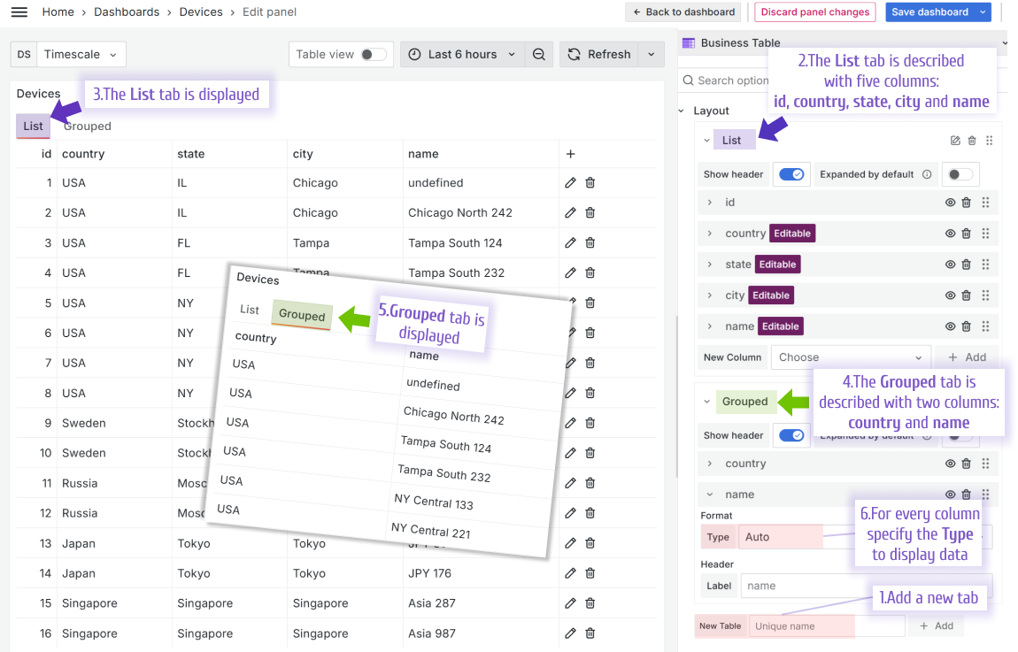 SQL to return data frame for the Business Table panel: