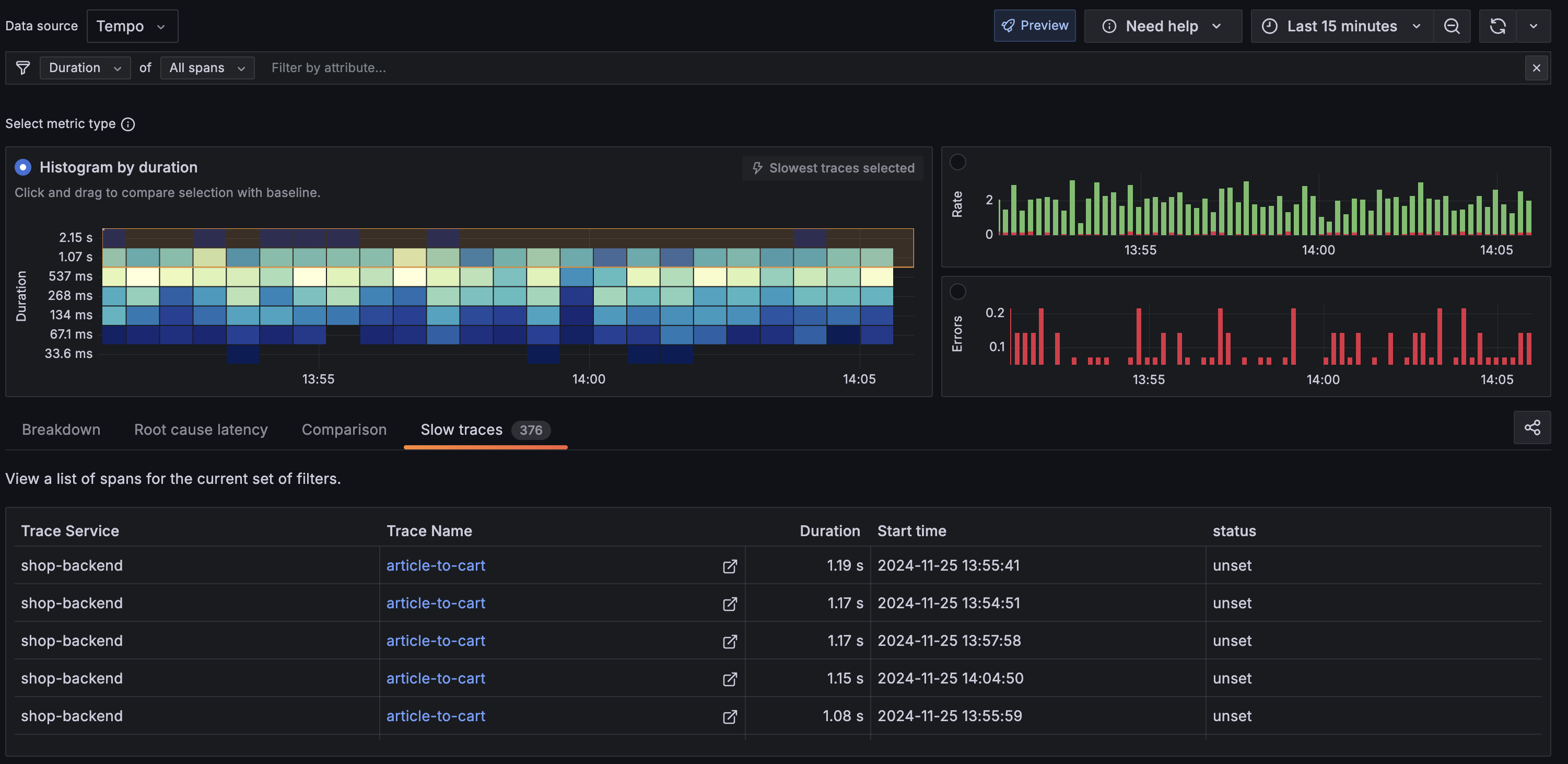 shop-backend appears to be the primary culprit for the slow traces. This happens when a user initiates the article-to-cart operation. From here, you can select the Trace Name to open the Trace View panel.