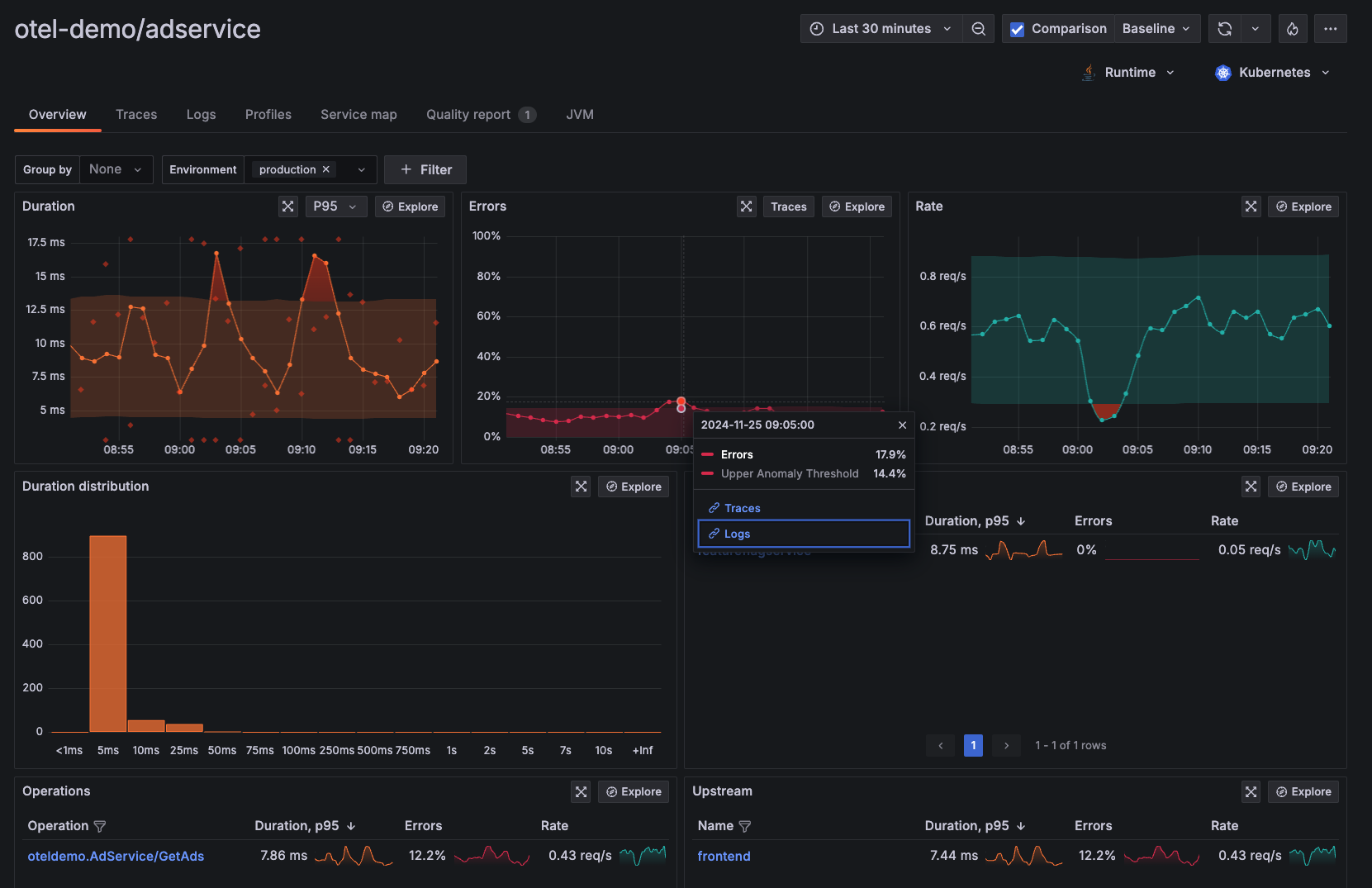 アプリケーションによって生成されたログは、Prometheusのメトリクスとネイティブに関連付けられ、より深い分析結果を得て、根本原因の検出を早めることができます。