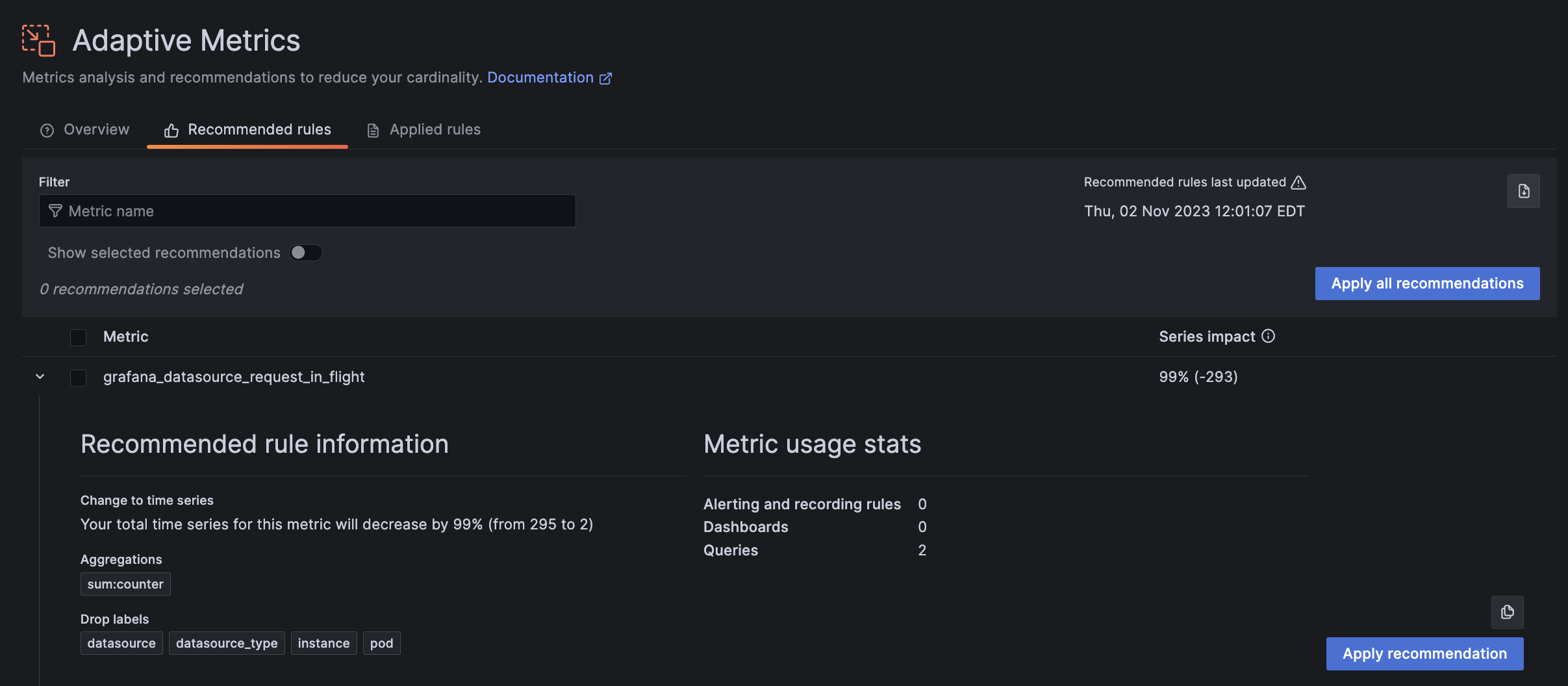 Recommended aggregations respect historic usage patterns; they won’t break existing dashboards, alerts, or previously run queries.