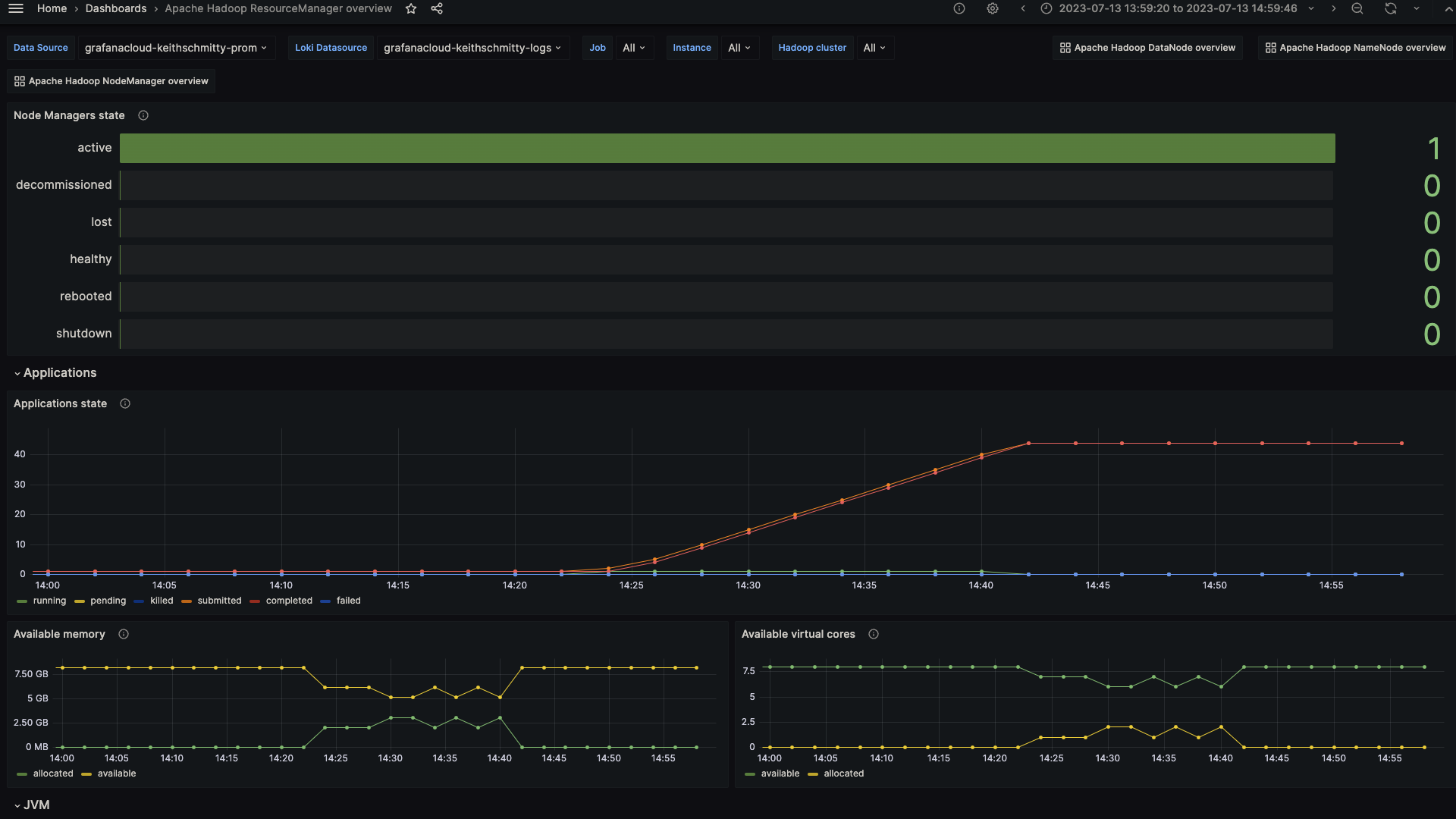 Easily monitor Apache Hadoop, an open source framework designed to process and store large amounts of data across distributed clusters of computers, with Grafana Cloud’s out-of-the-box monitoring solution. The Grafana Cloud forever free tier includes 3 users and up to 10k metrics series to support your monitoring needs.