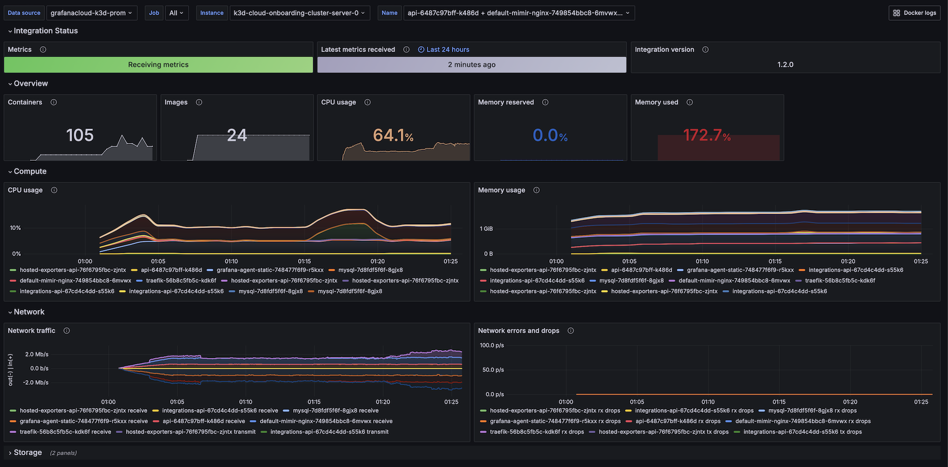 Easily monitor your Docker deployment with Grafana Cloud’s out-of-the-box monitoring solution. The Grafana Cloud forever free tier includes 3 users and up to 10k metrics series to support your monitoring needs.