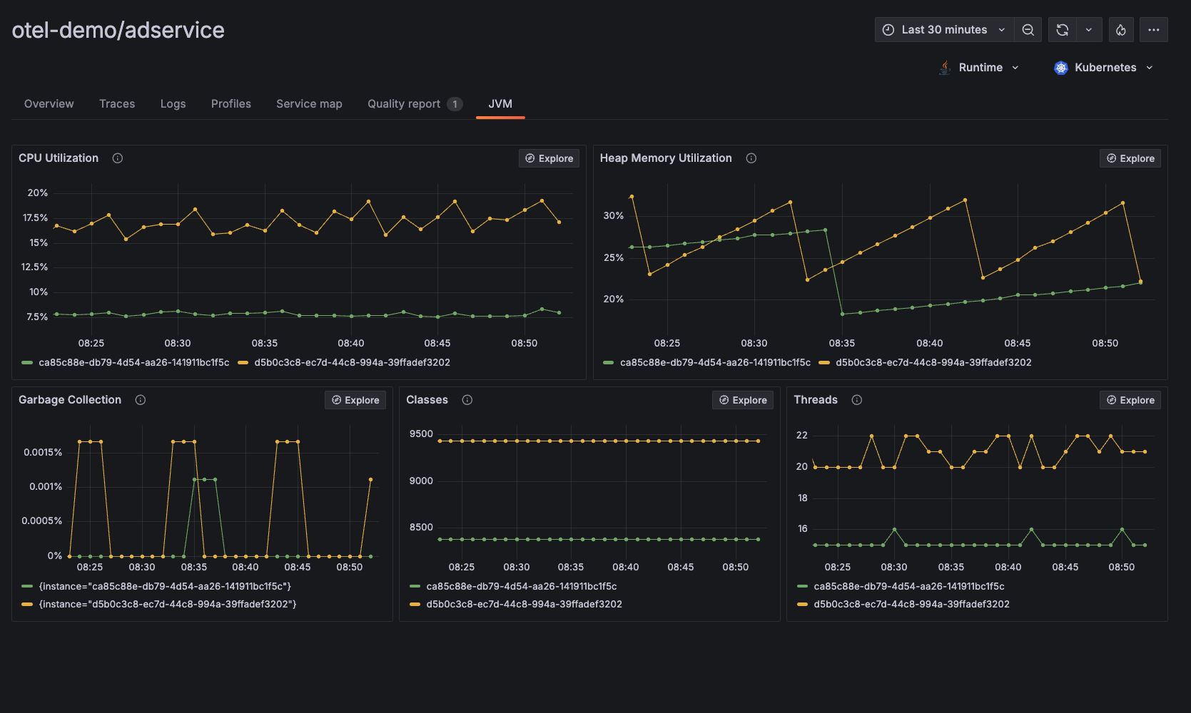 - JVM-level observability data including CPU utilization, heap memory utilization, garbage collection, classes, threads, and more.