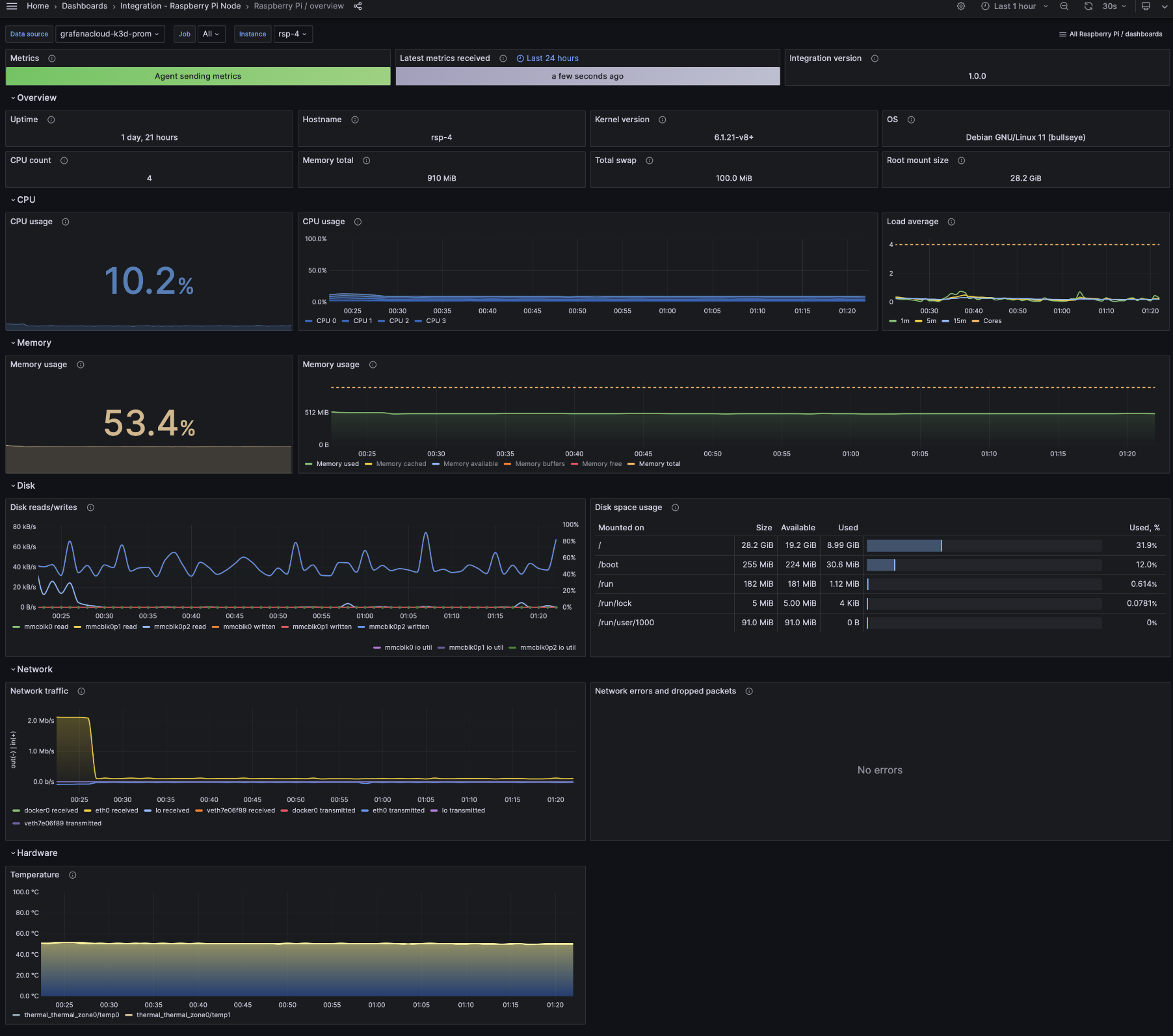 The Raspberry Pi integration for Grafana Cloud provides a streamlined way to monitor Raspberry Pi devices using Grafana. It includes dashboards and alerts for metrics such as CPU usage, memory consumption, and disk I/O, making it easy and efficient to track device performance and health.