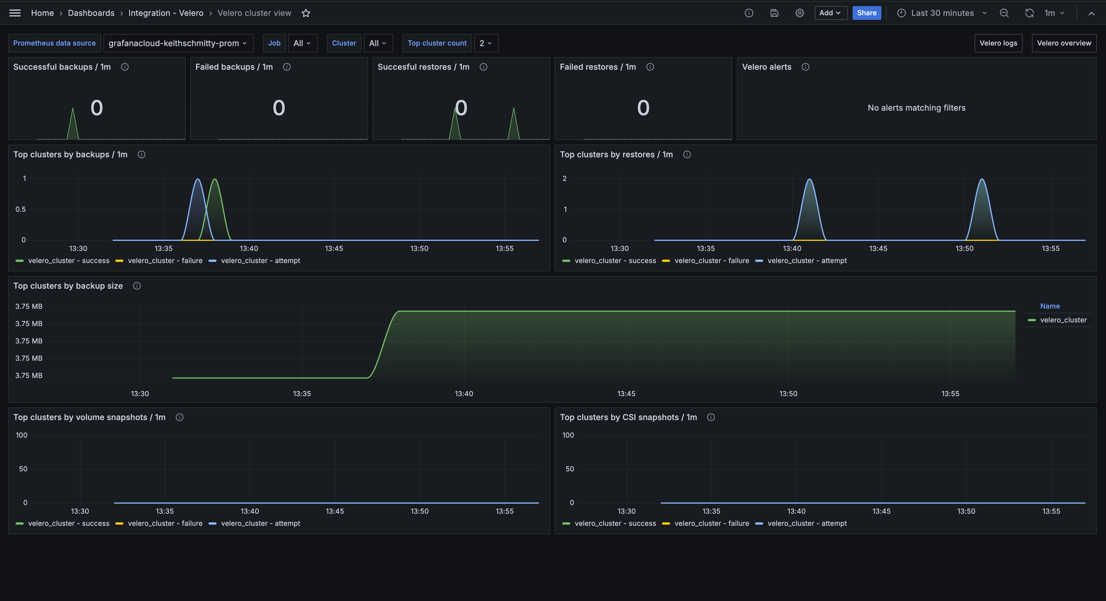 Easily monitor your deployment Velero, an open source tool that helps back up and migrate Kubernetes cluster resources and persistent volumes, with Grafana Cloud’s out-of-the-box monitoring solution. The Grafana Cloud forever-free tier includes 3 users and up to 10k metrics series to support your monitoring needs.
