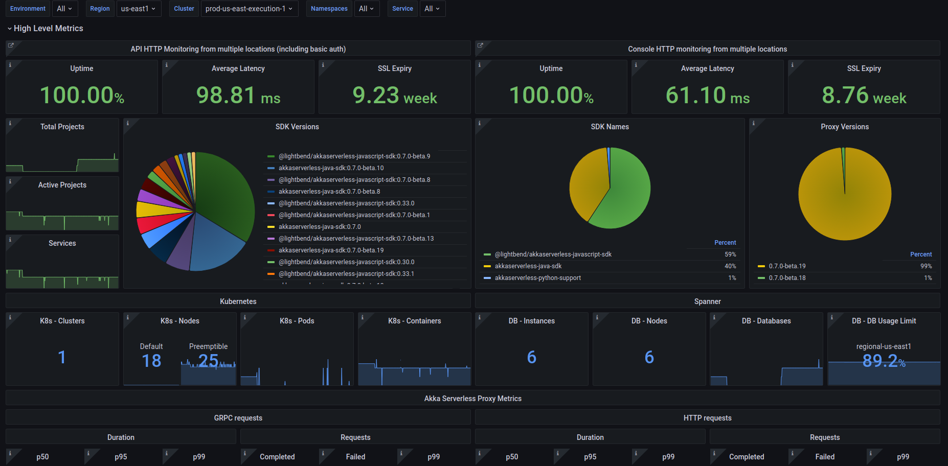 This synthetic dashboard monitors Akka Serverless’ API availability. Its API is one of the key parts of the system since it’s the entrypoint for its customers to interact with the system and manage their services.