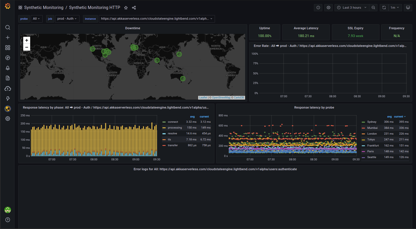 Lightbend also uses synthetic monitoring, a key feature of Grafana Cloud. The Akka Serverless metrics dashboard below includes times for some of the external endpoints, which Costa calculates with data from synthetics. He plans to do more. “We’re now designing how we will be using synthetics to monitor the response time and availability of each deployed service from different geographies — like a basic validation,” he explains. Lightbend will use that as a part of its SLO reporting.