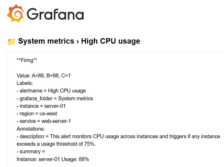 This approach is helpful when you want to reduce notification noise, especially in situations where multiple instances of an alert are firing at the same time (e.g., high CPU usage across several instances). You can leverage templates to create a unified, easy-to-read notification that includes all the pertinent details.