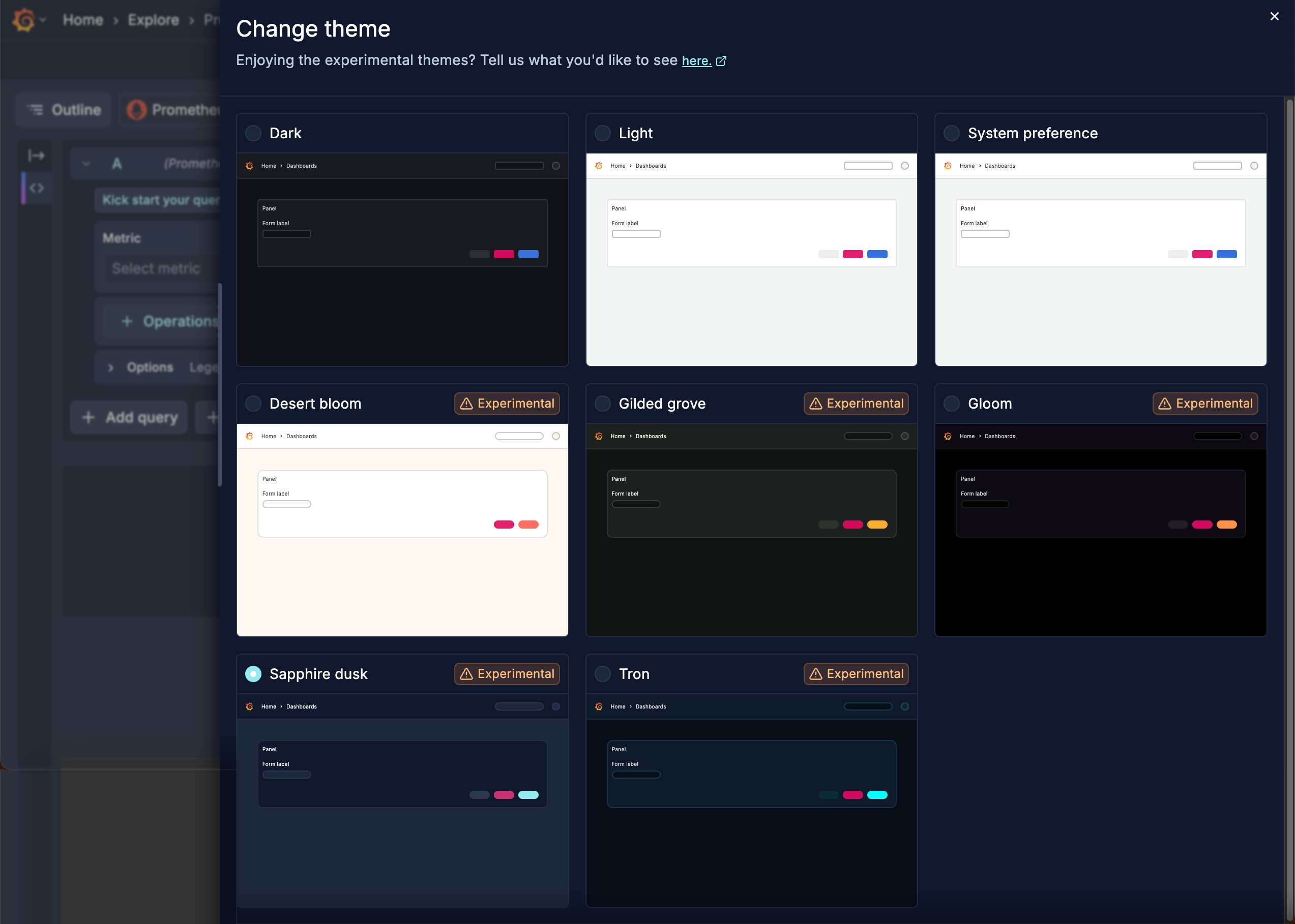 We’re giving the community early access to several new experimental themes to celebrate the release of Grafana 12! You can jazz up your Grafana experience with Sapphire dusk, Tron, Gilded grove, Gloom, or Desert bloom. To see the color scheme of a theme before selecting it, click the user icon in the top-right corner of the page and select Change theme.