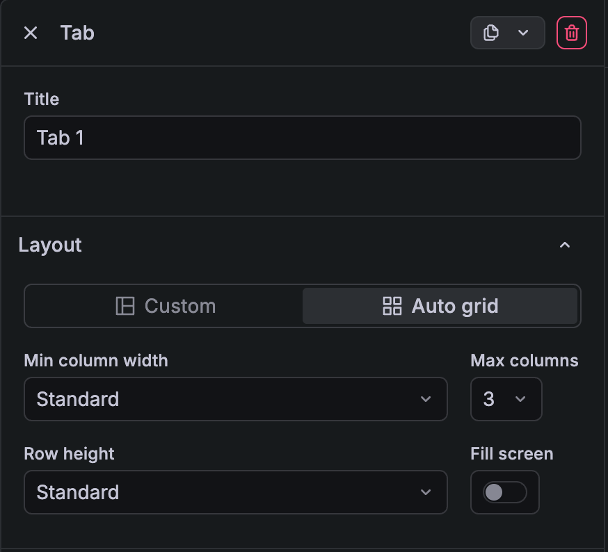 Set your row, tab, or dashboard to Auto grid so the panel size adapts to the space available in the display. Configure minimum column width, row height, and the maximum number of columns per row to meet your requirements. If you prefer setting different panel widths and heights within the same row, you can use the Custom layout option, which is the same as the pre-Dynamic dashboards grid. Auto grid also enables the show/hide functionality. (To avoid leaving unsightly gaps in the dashboard, we require you to set the layout to auto grid before configuring any show/hide rules.)