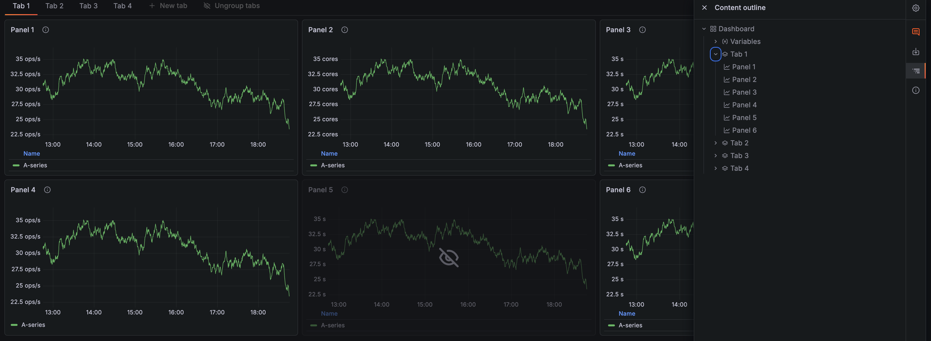 Find the content you need in your dashboards easily through a clickable outline. As an editor, click on an element in the outline to scroll to it and select it to make quick changes to the title or description. As a viewer, click on a panel, row, or tab to navigate to it instantly and find the information you’re looking for.