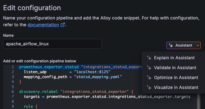 Grafana Fleet Management has introduced an integrated Assistant experience for configuration pipelines. With preconfigured prompts, you can use Assistant to explain, validate, fix, optimize, or visualize your pipelines.