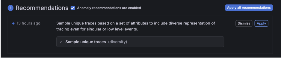 Diversity sampling captures at least one trace for each unique trace combination (fingerprint) within a fixed time window. These combinations are defined by attributes such as service, route, and status code. With this baseline coverage in place, you can reduce probabilistic sampling rates and avoid creating and managing additional policies just to make sure developers find the traces they need.