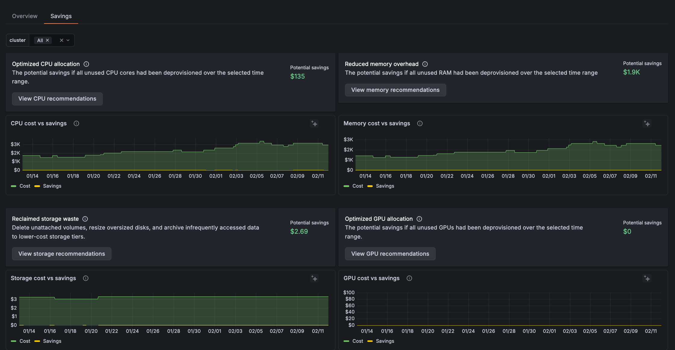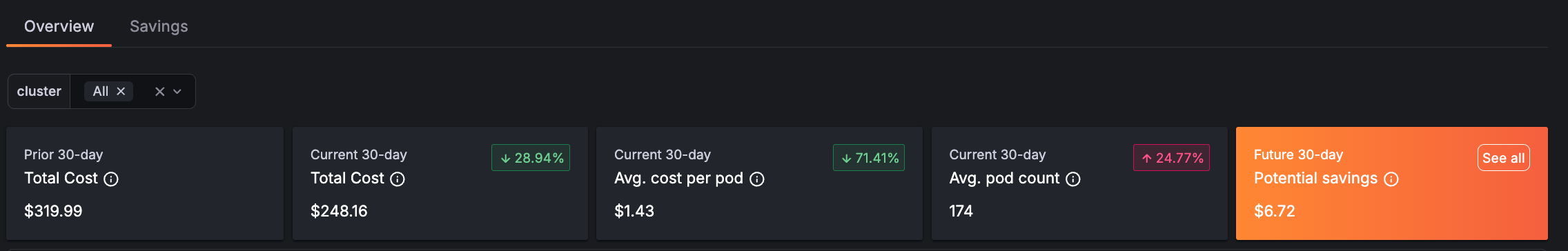 Kubernetes costs are notoriously hard to track and optimize. New Overview and Savings tabs in Kubernetes Monitoring show: