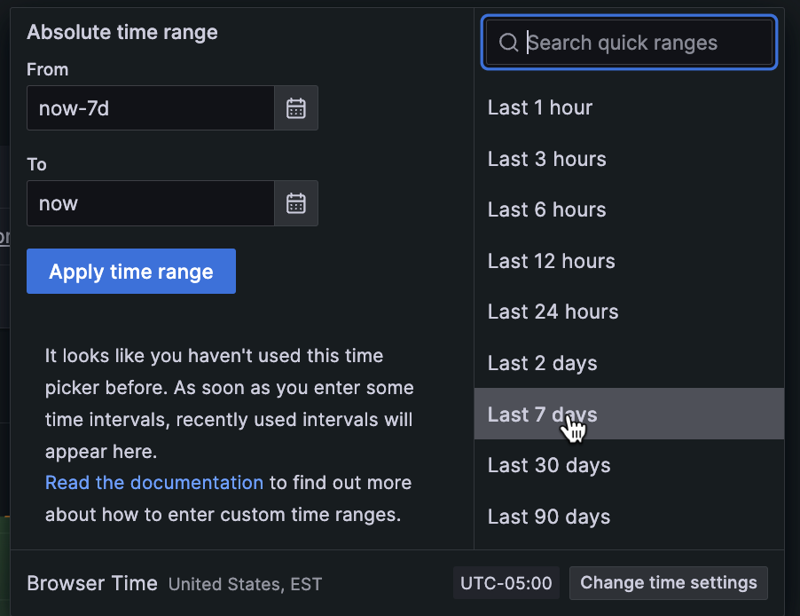 To aid in understanding historical data, a time range selector is available on every page of Kubernetes Monitoring where this function is appropriate. This selector is also available on the Workloads detail page, for detecting outlier CPU usage in the Pods. (Release 1.4.0)