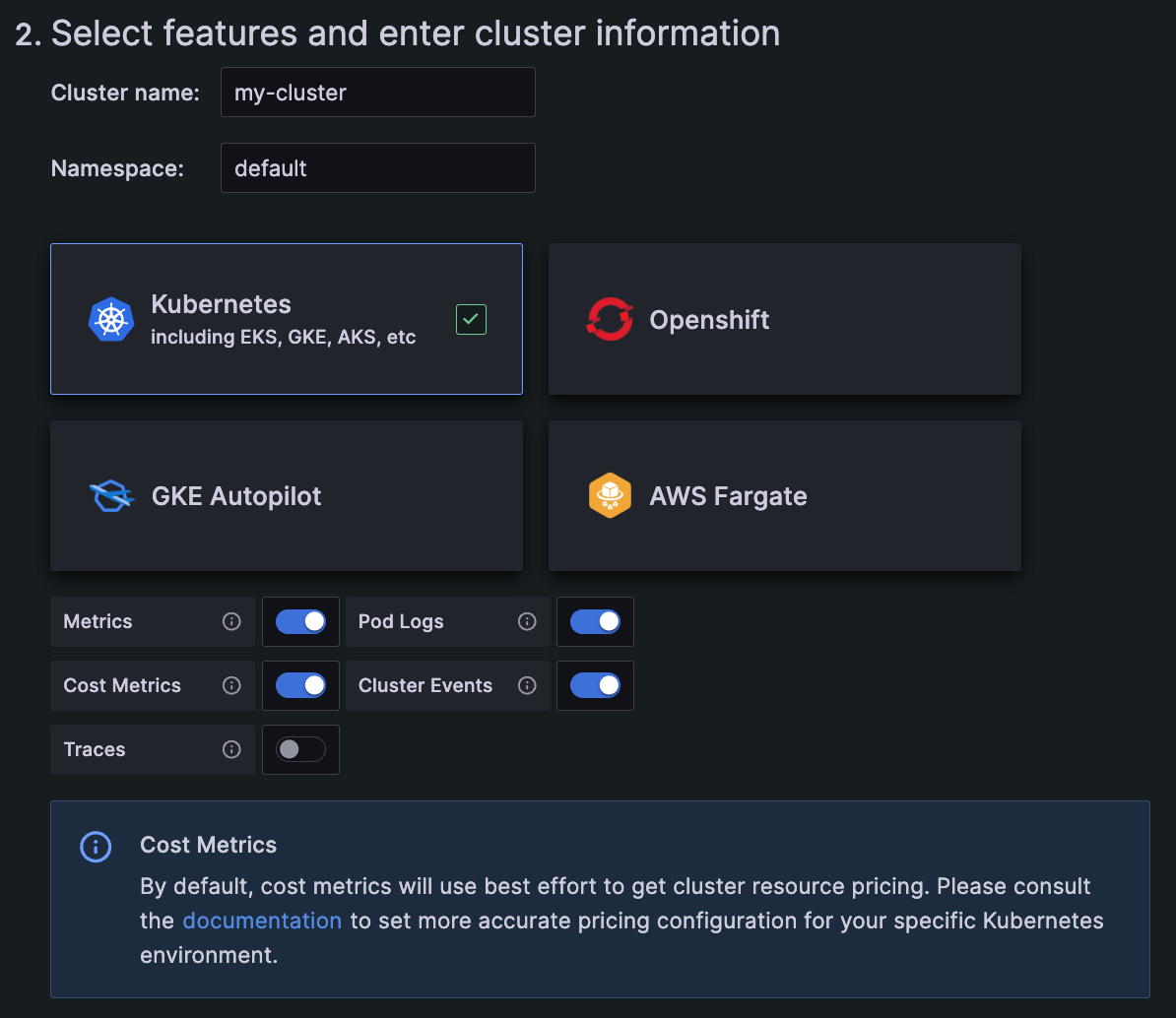 When configuring Kubernetes Monitoring with the streamlined configuration wizard that uses Grafana Kubernetes Helm Chart, you can select the platform you are using.
