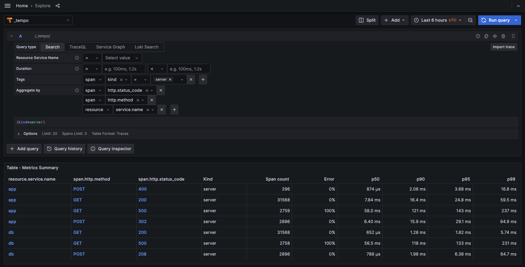 We’ve added an Aggregate By option to the TraceQL query editor to leverage Grafana Cloud Traces’ metrics summary API. You can calculate RED metrics (total span count, percent erroring spans, and latency information) for spans of kind=server received in the last hour that match your filter criteria, grouped by whatever attributes you specify.
